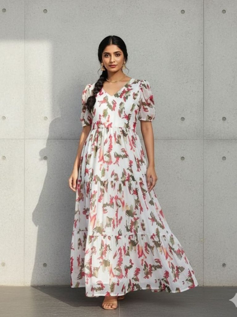 Material:- Fox GeorgetteComplete LinningLength:- 47Sleeves :- Sleeve LessFlare 3.5 MeterSize S-36 M-38 L-40 Xl-42 Xxl-44