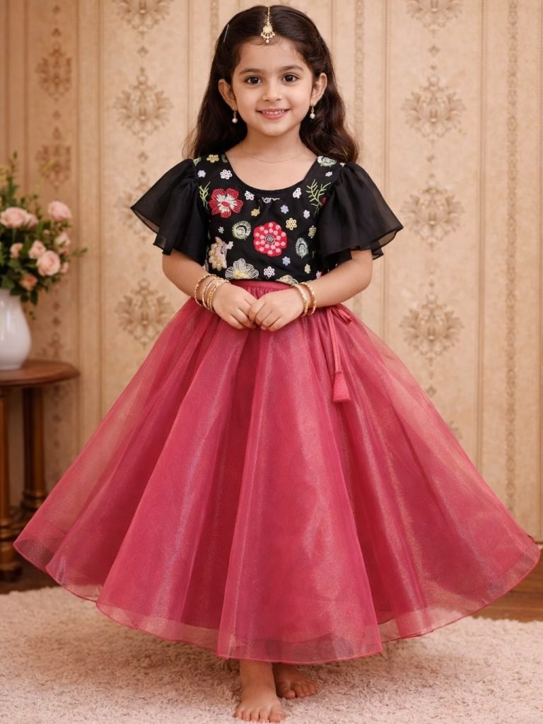 Black Blouse With Onine Pink Colour Kids Lehenga