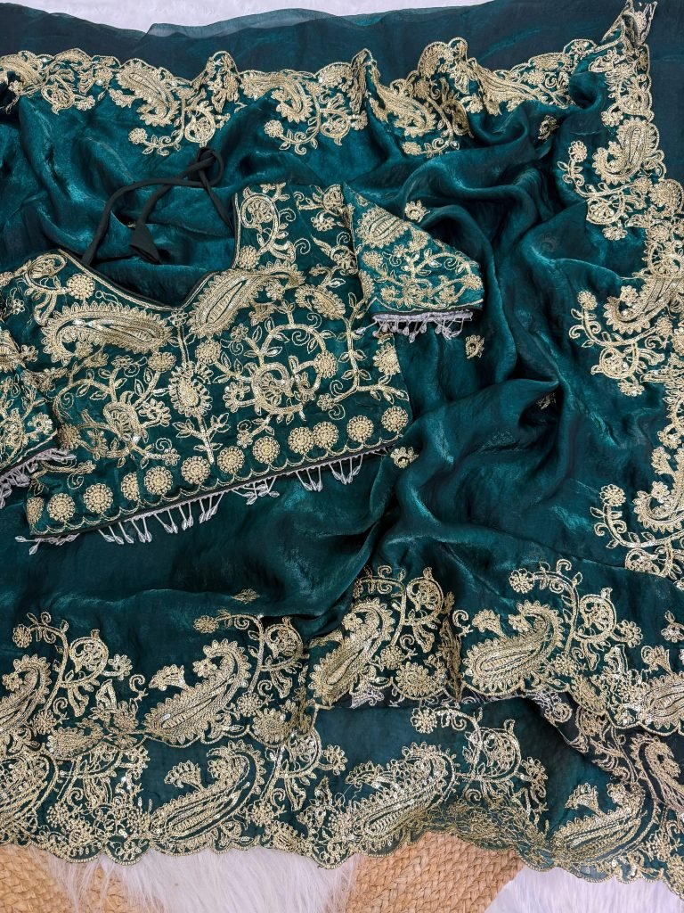 Is festive season mein apni shaan aur style ko enhance karein Rama Green Fancy Fendy Satin Saree ke saath. Yeh saree all-over zari sequins work se sajayi gayi hai, jo aapko har angle se chamakta hua look deti hai.