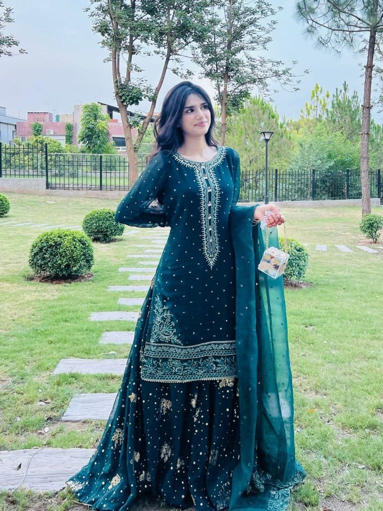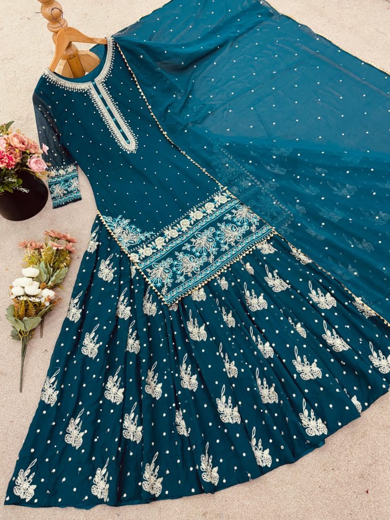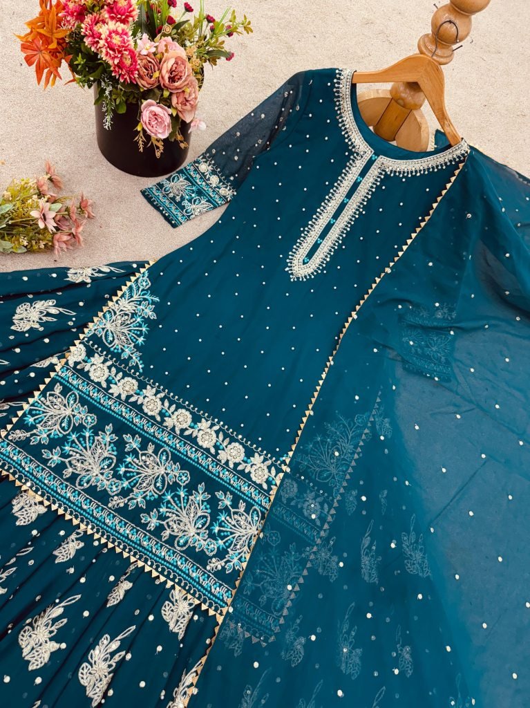 Elevate Your Festive Look With This Stunning Party-wear Set, Crafted In Premium Faux Georgette With Heavy Embroidery And Sequence Work. Designed For Effortless Elegance.