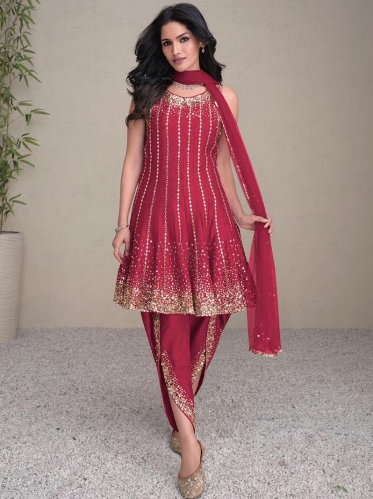 Fabric: Real Premium SilkWork: Elegant EmbroiderySleeves: Full SleevesBottom: Silk DhotiDupatta: Embroidered Net DupattaOccasion: Festive Wear, Wedding Functions, Party Wear