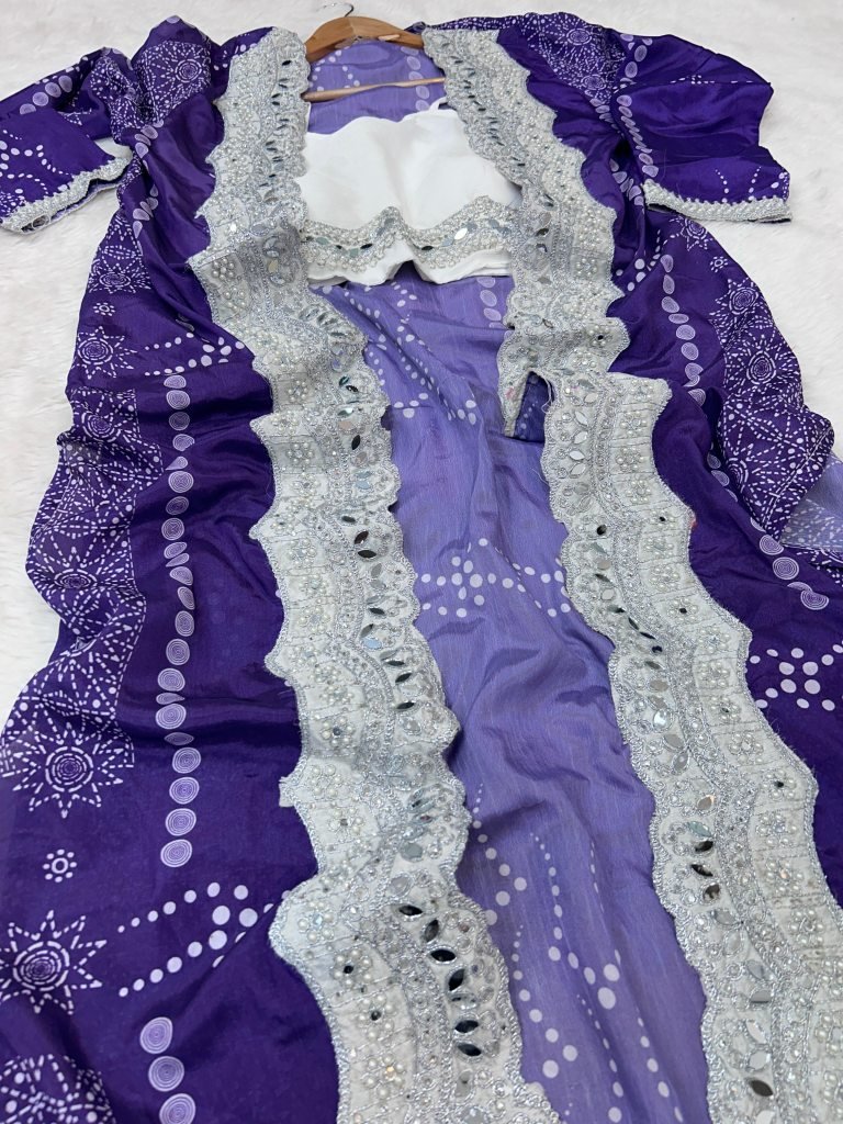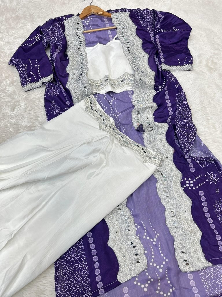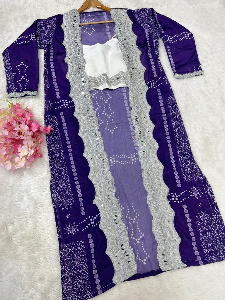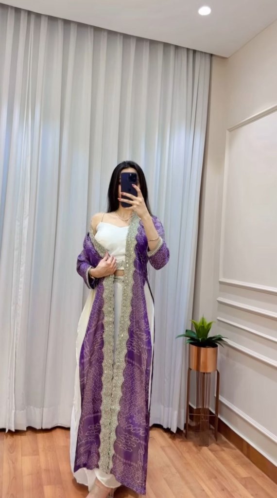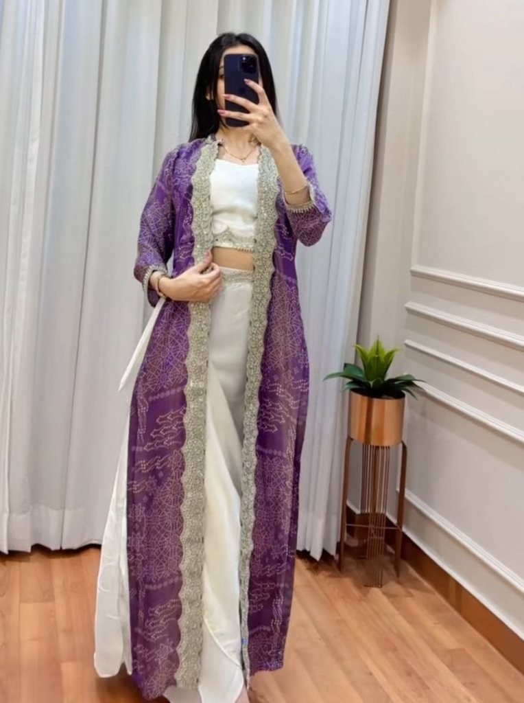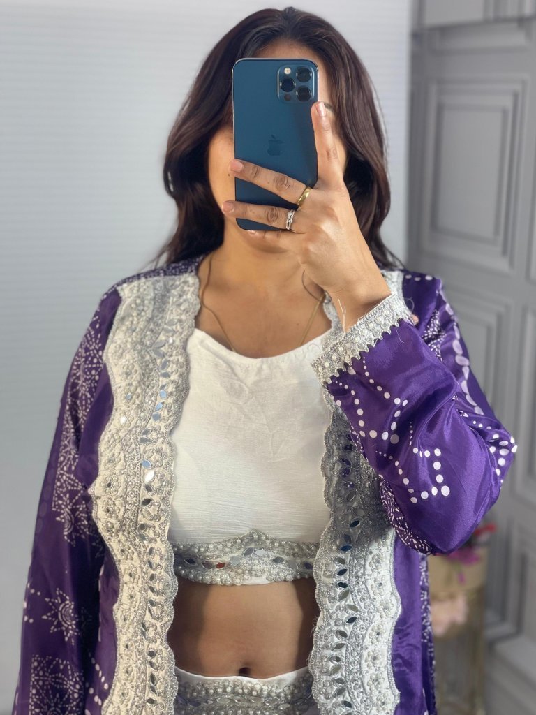 Beautiful Chinon Fabric Crop Top With Fusion Drape Skirt With Crape Lining & Long Jacket