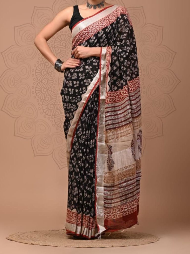 • Designer Black Linen Digital Printed Saree With Matching Black Blouse