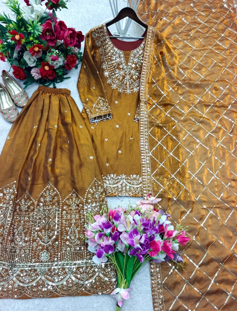 Sharara Fabric: Pure Fendy Silk With 5mm Sequence Embroidery Work, Elastic Waist