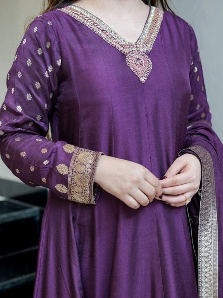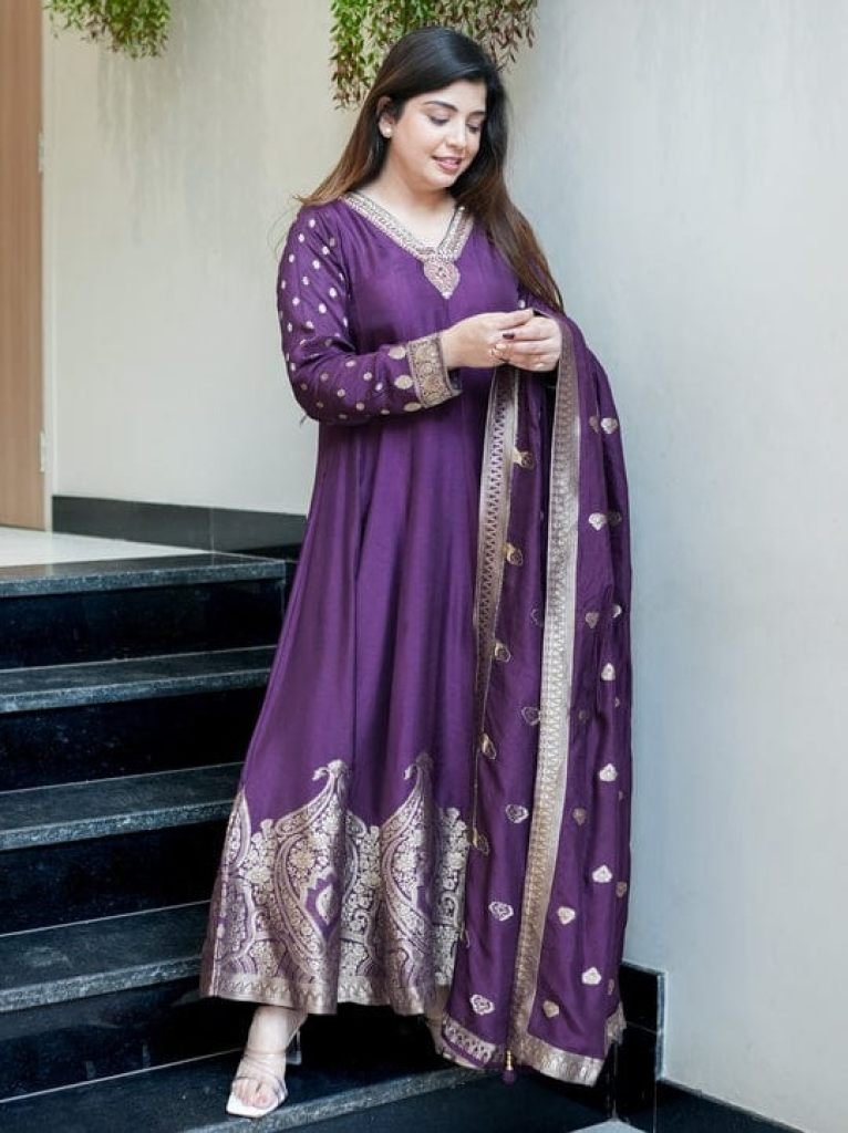 Elegance That Speaks Without Words A Premium Anarkali Style Outfit Crafted On Chanderi Base Fabric With Beautiful Hand Worked Neckline Banarasi Zari Weaving Detailing On The Flare And Dupatta Perfect Choice For Wedding, Party And Festive Functions