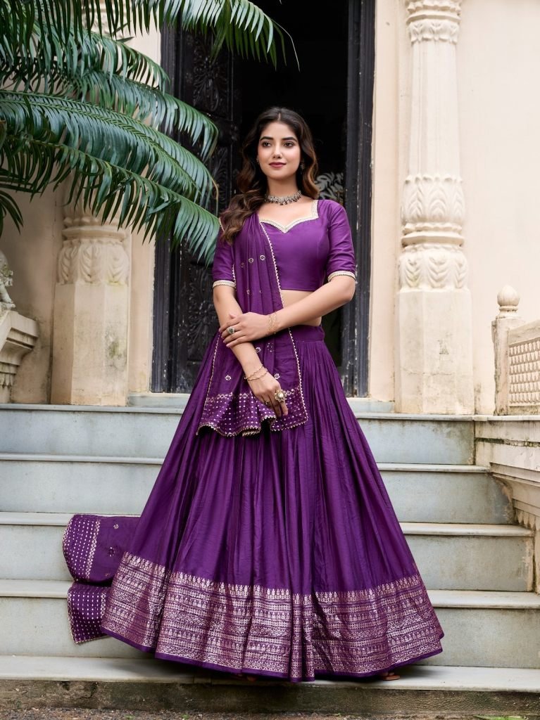 • Exclusive Lavender Pure Chanderi Silk Lehenga Choli Set With Sequins Embroidered Dupatta