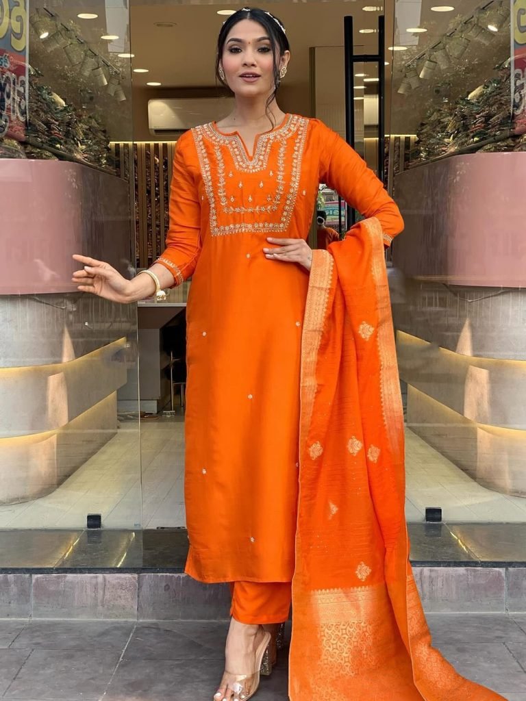Best Roman Silk Fabric Kurti With Pant With Latkan Dupatta
