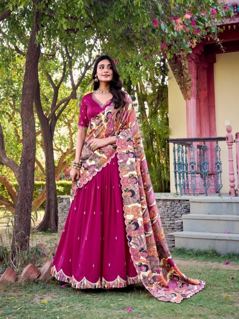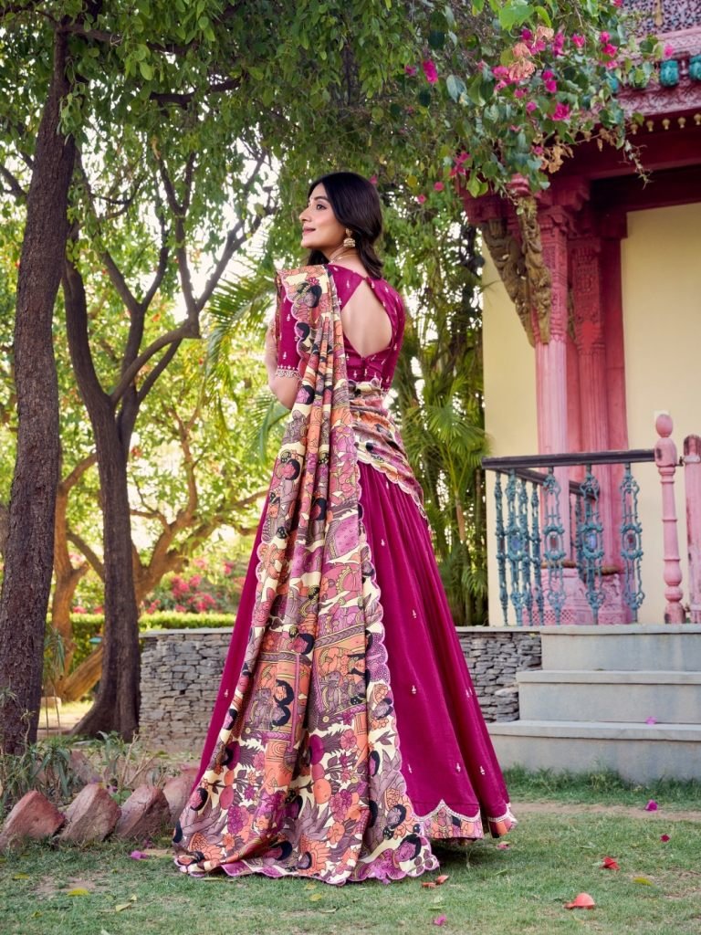 Lehenga Work : Sequins And Thread Embroidery Work With Kalamkari Print Border