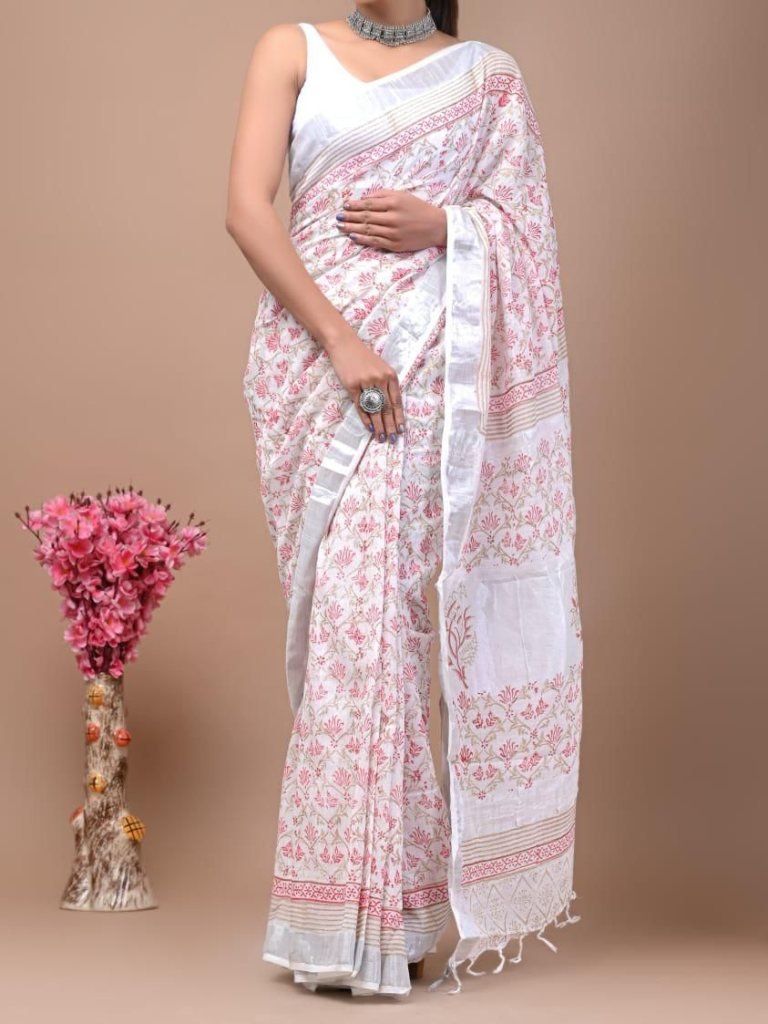 Fabric :- Linen Saree With Beautiful Digital Printed Pallu Silver Jari Weaving BorderBlouse :- Running Colour With Digital Printed Cut :- 6.30 Meter