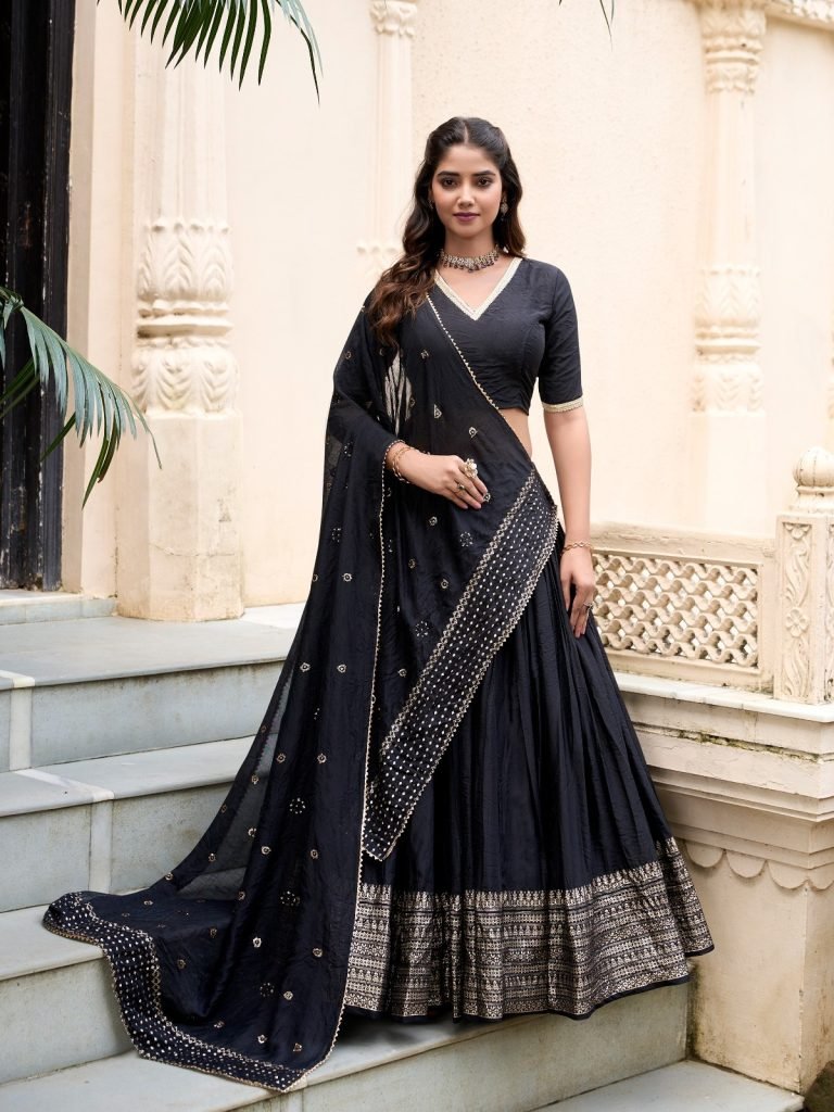 Elegant Black Pure Chanderi Silk Lehenga Choli Set With Zari Weaving Border
