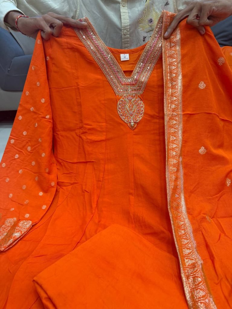 Elegance That Speaks Without Words A Premium Anarkali Style Outfit Crafted On Chanderi Base Fabric With Beautiful Hand Worked Neckline Banarasi Zari Weaving Detailing On The Flare And Dupatta Perfect Choice For Wedding, Party And Festive Functions