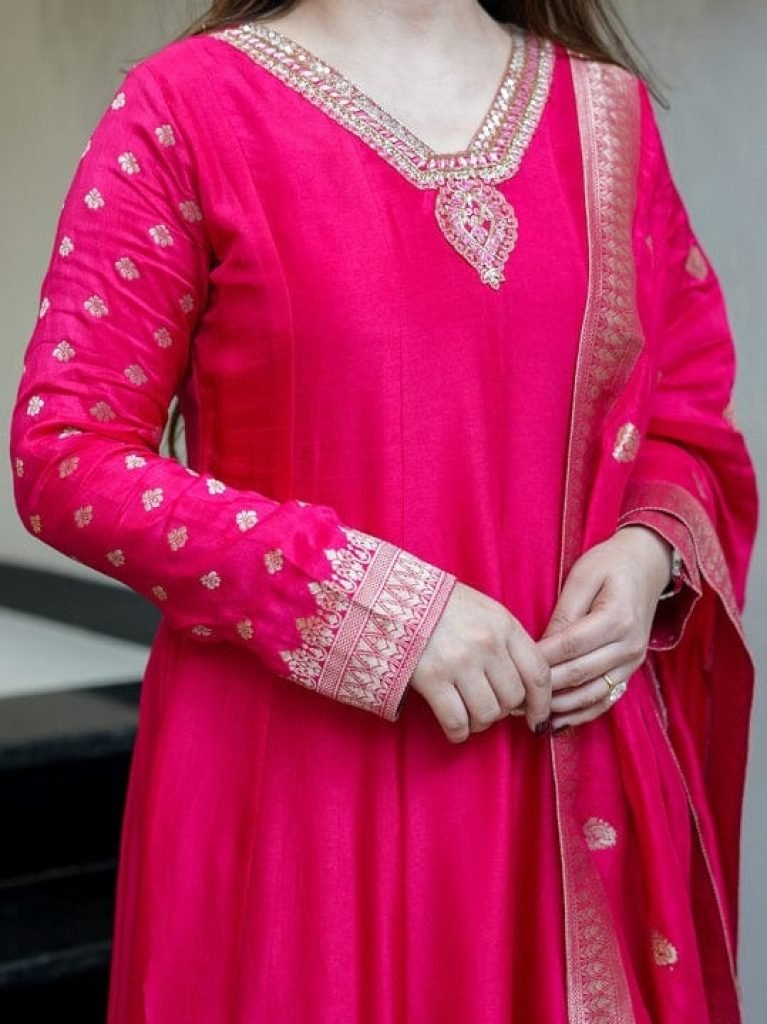 Elegance That Speaks Without Words A Premium Anarkali Style Outfit Crafted On Chanderi Base Fabric With Beautiful Hand Worked Neckline Banarasi Zari Weaving Detailing On The Flare And Dupatta Perfect Choice For Wedding, Party And Festive Functions