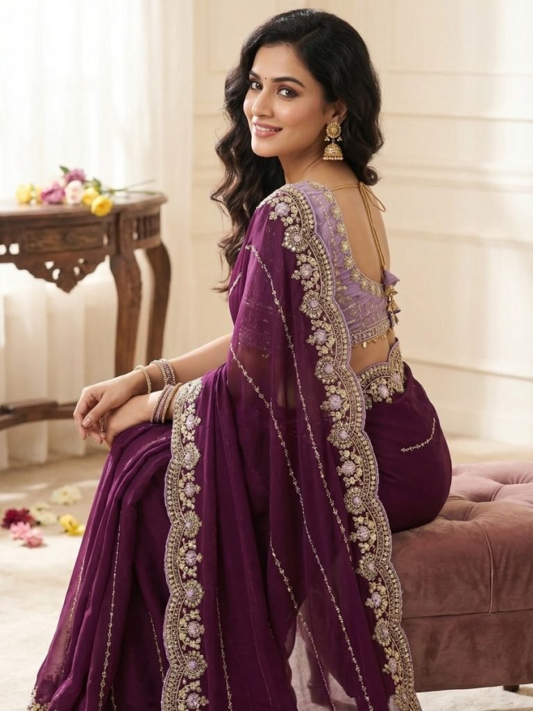 Saree:- Very Soft & Elegant Rich Look Fendy Sartin Fabric With Beautiful Embroidery 3 Mm Sequence Work Heavy Border With Buttis In All Over Saree Aarco