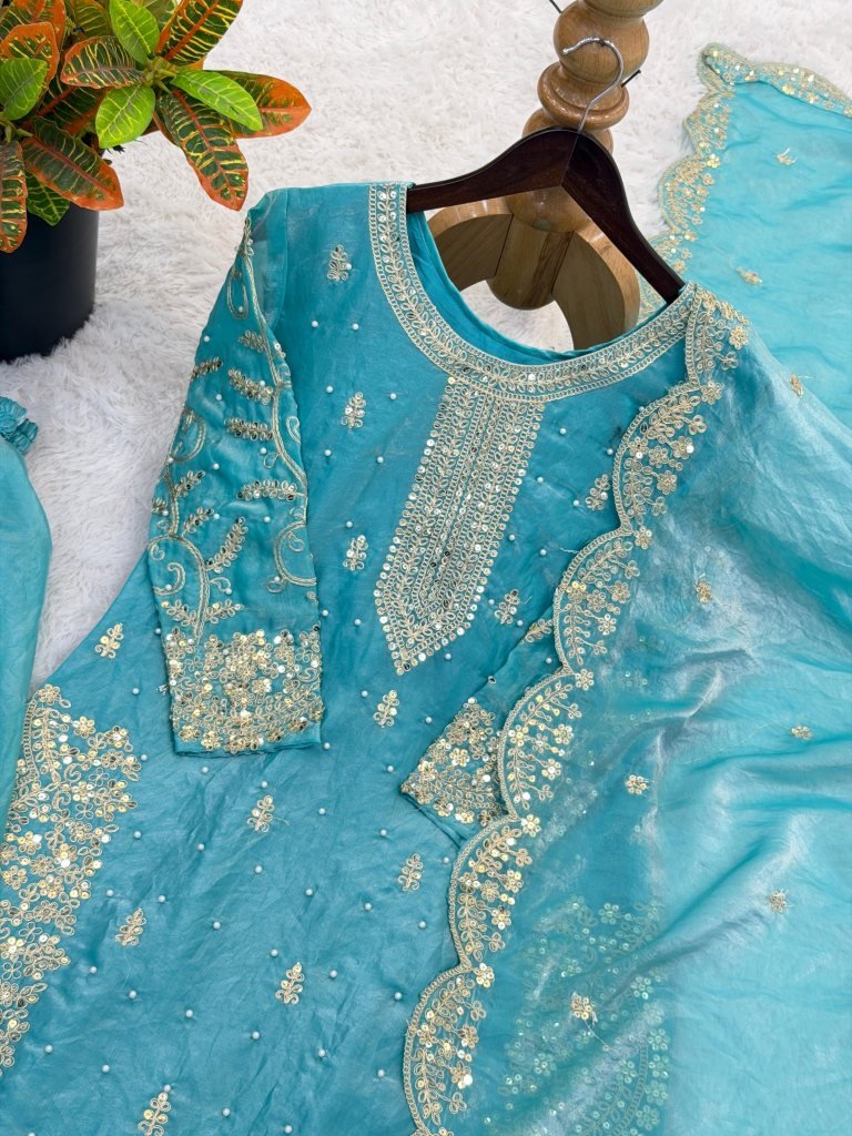 • Eid Special Fendy Silk Teal Blue Palzzo Suit With Embroidery Sequence Work Dupatta