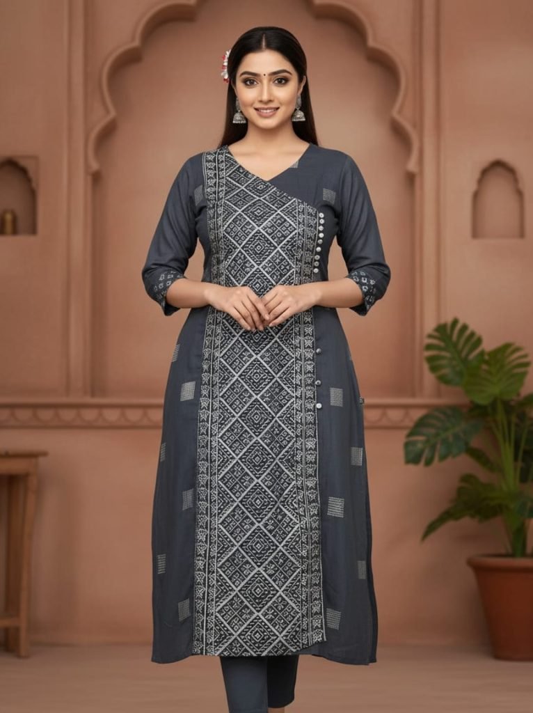 Fabric : Rayon Cotton Table Print With Pure Cotton Crucial LaceType : Jacket Style / Shrug Gown Kurti A Line Kurti Length : 46Sleeve Length : 17