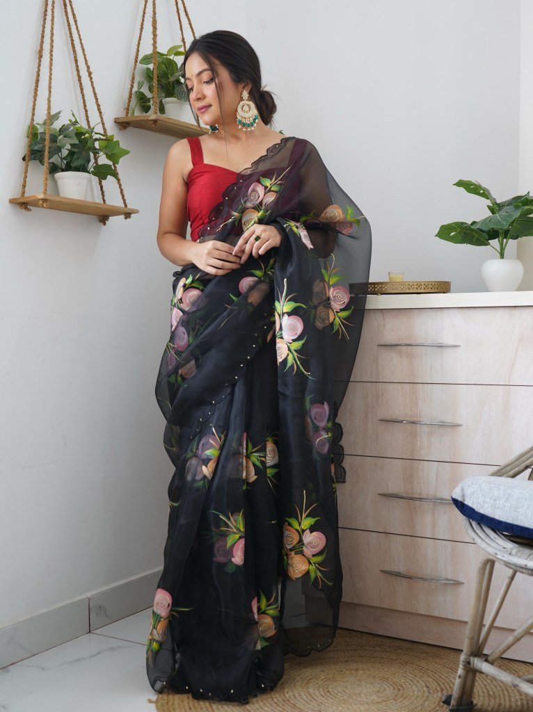 Organza Silk and the making being hand painted loveliness. This gorgeous Organza Saree with handprints foil motif all over is splendiferous and the contrast of is beautiful. This floaty, fine-spun organza saree mesmerizes the eyes on you. Moreover, Organza is one of the priorities when dressing up for occasions.