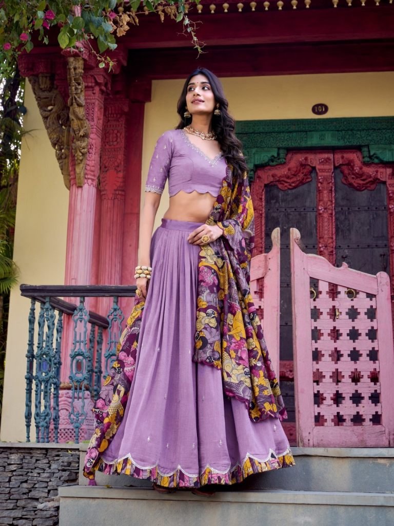 Lehenga Work : Sequins And Thread Embroidery Work With Kalamkari Print Border