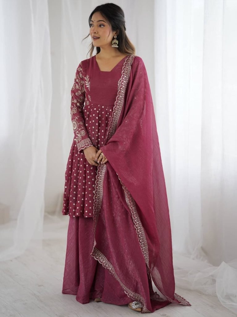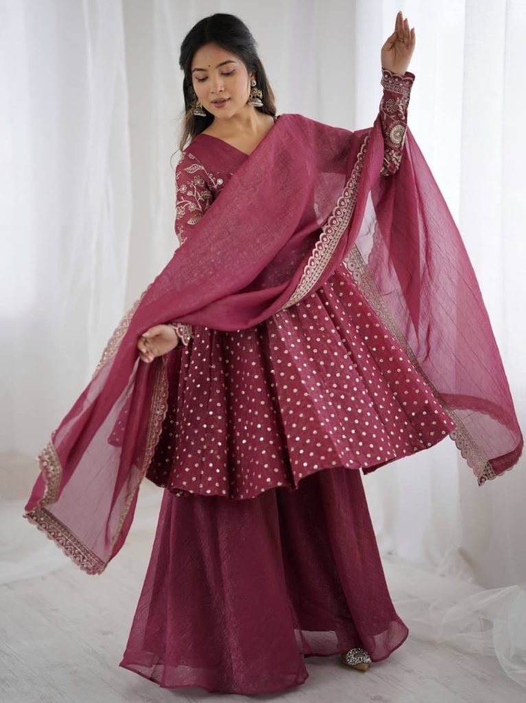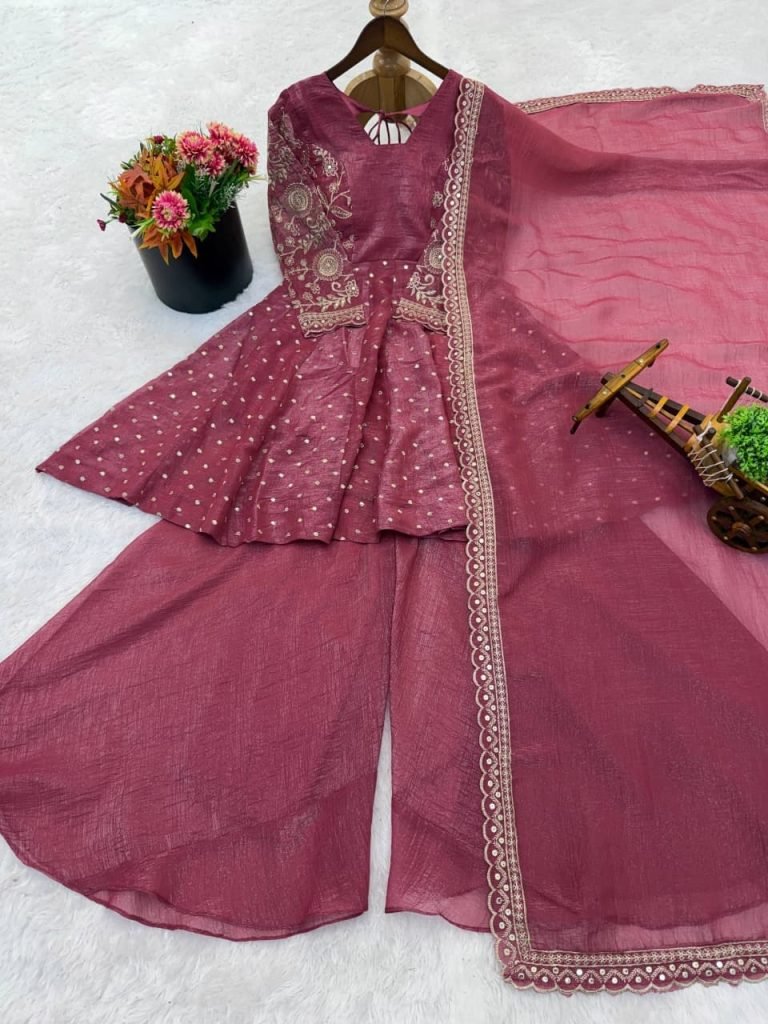 Plazzo Fabrics : Pure Gmy Silk With Heavy Embroidery Coding Dori-sequence Work And Rivet Miti Work With Elastic