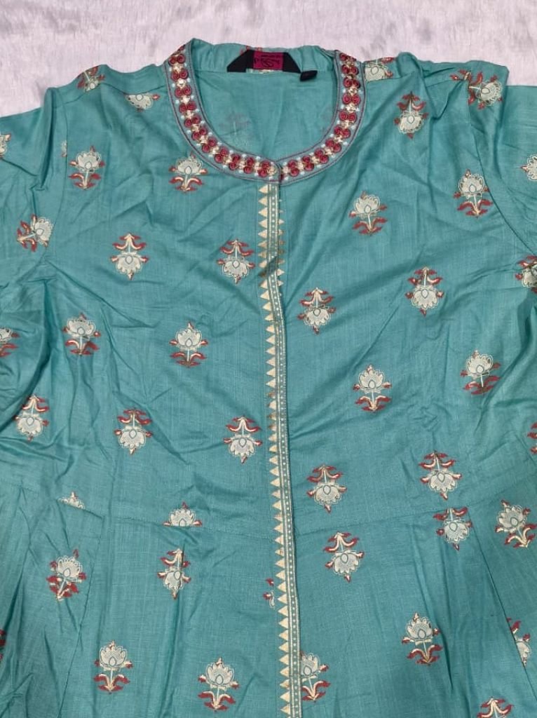 Fabric : Rayon Cotton Table Print With Pure Cotton Crucial LaceType : Jacket Style / Shrug Gown Kurti A Line Kurti Length : 46Sleeve Length : 17