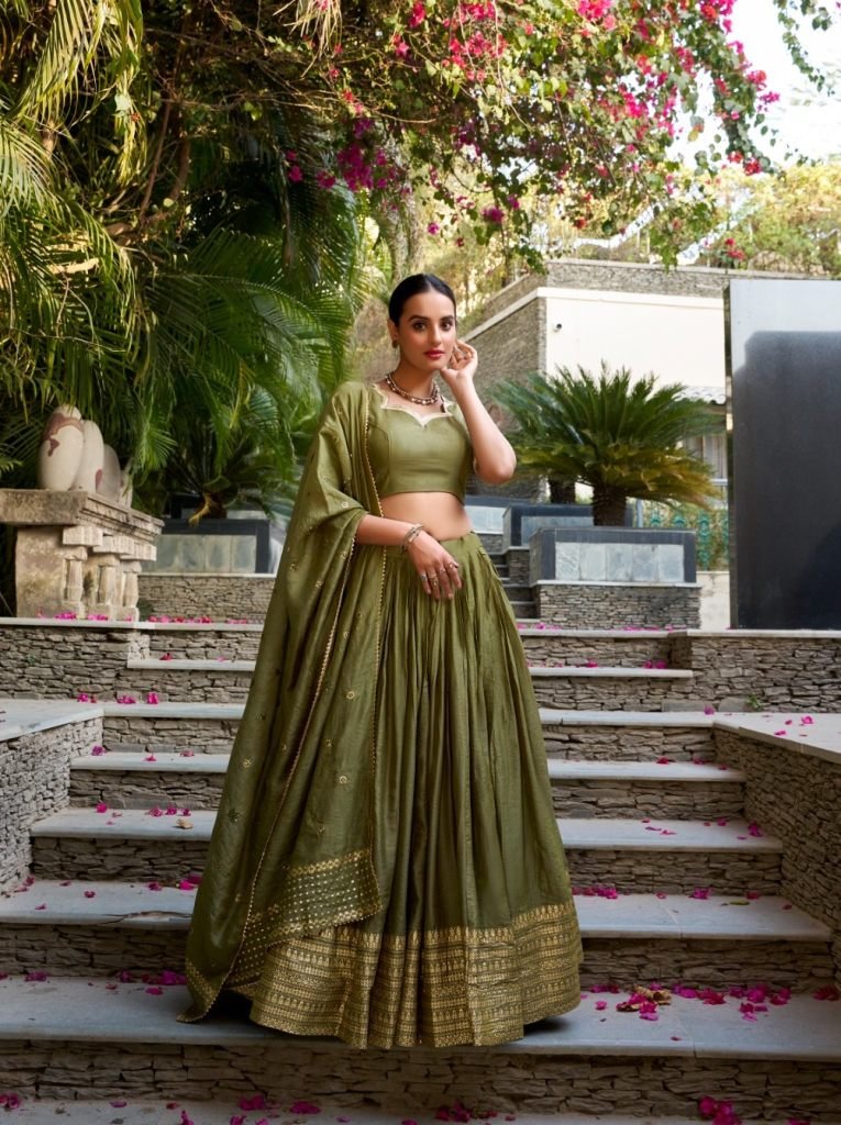 • Beautiful Sea Green Pure Chanderi Silk Lehenga Choli Set With Sequins Embroidered Dupatta