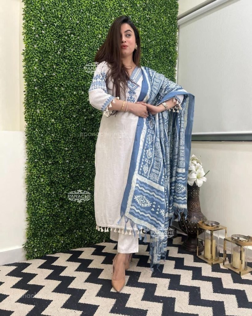 Pure Fine Katha Cotton Fabric Straight Kurti With Pant And Dupatta