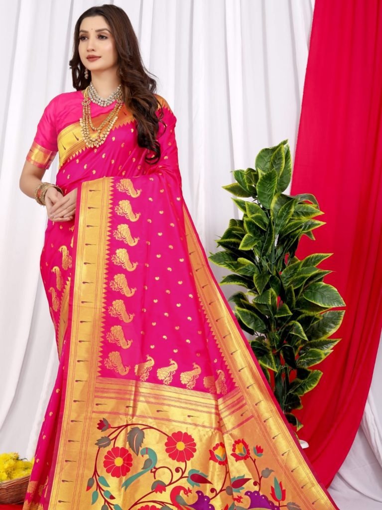 Fabric Details :-Paithani Pure Silk Handloom Saree With Pure Jari Pure Soft Silk With Gold JariSaree Cut 5.50 MeterBlouse 0.80 Meter