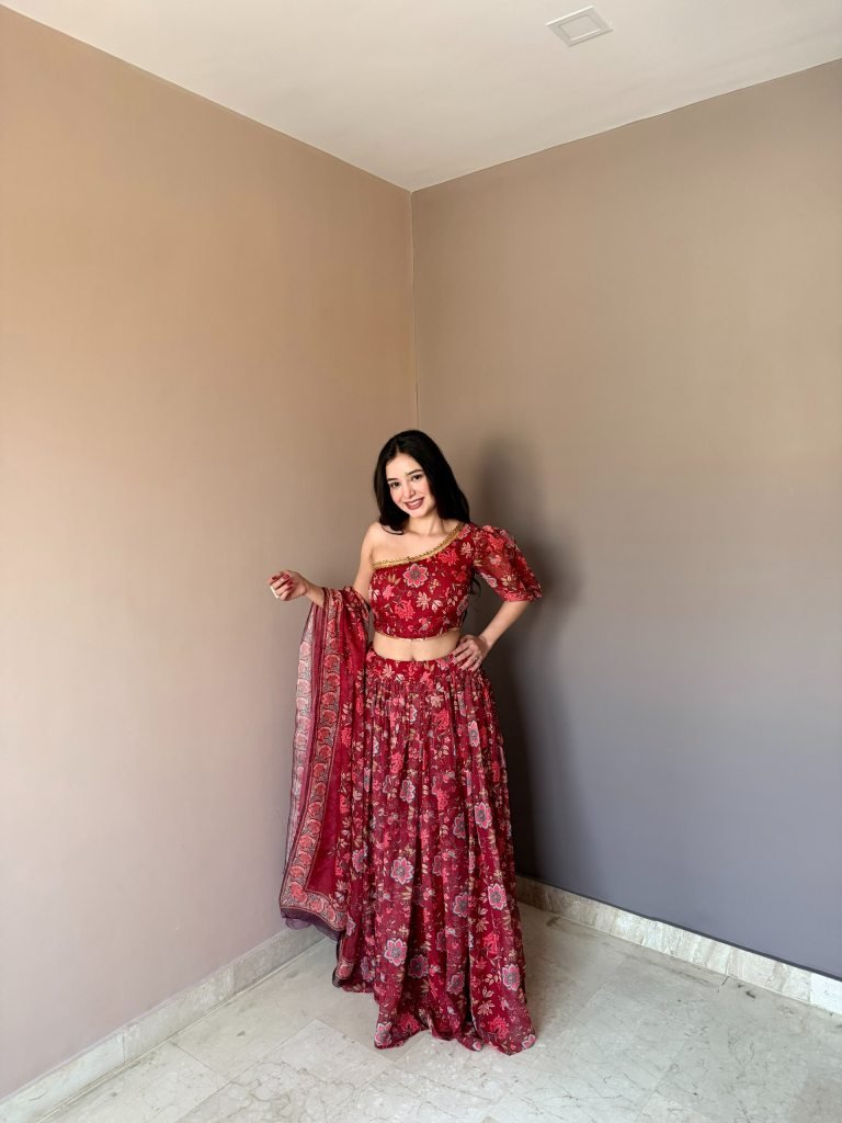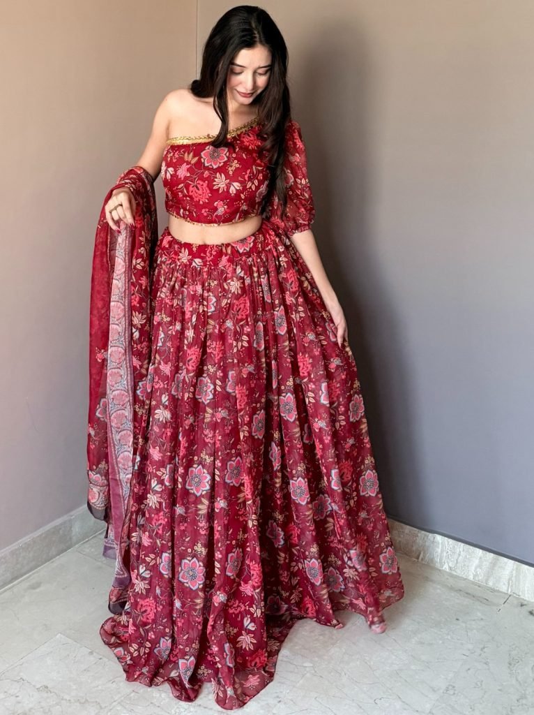 Lehenga – Beautiful All-Over Floral Printed Lehenga With Rich Multi-Panel Flair, Approx. 4.5 Mtr Flair, Comfortable Elastic Waist & Graceful Fall