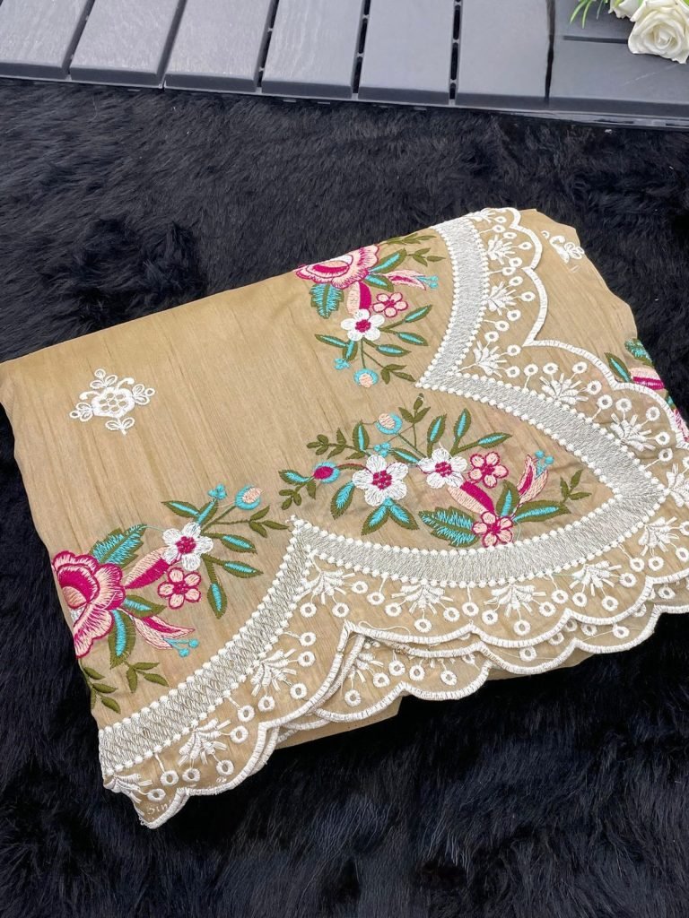 Crafted in pure silk, it features delicate floral thread embroidery with fine cutwork, making it a true masterpiece of traditional artistry. The vibrant multicolored border with big butti weaving adds a rich and royal charm, perfect for festive and special occasions.