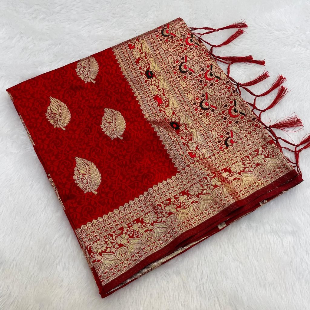 Elevate your elegance with this stunning red Kamya silk saree from Fashion Bazar. Crafted from tissue soft silk, this saree offers a luxurious feel while ensuring lightweight comfort for all-day wear. Featuring exquisite Banarasi weaving, it reflects timeless tradition and intricate craftsmanship. Perfect for festive occasions, weddings, or special celebrations, this saree combines vibrant color, superior quality, and classic style.