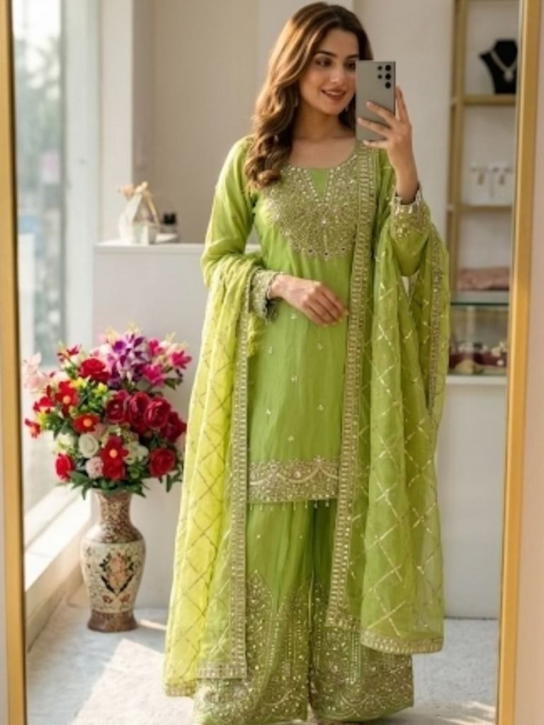 Sharara Fabric: Pure Fendy Silk With 5mm Sequence Embroidery Work, Elastic Waist