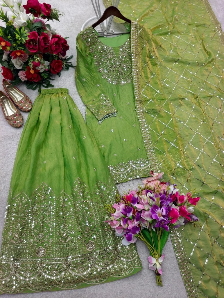 Top Fabric: Pure Fendy Silk With 5mm Sequence Embroidery Work, Full Sleeves, Moti Latkan Lace