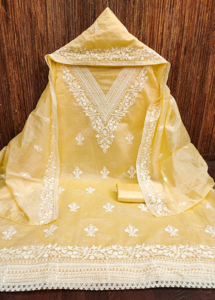 Material Details :-Top : Heavy Chanderi Neck Embroidery Work 1.9 MeterInner : Santoon 1.6 MeterBottom : Santoon 2 MeterDupatta : Chanderi 2.1 Meter
