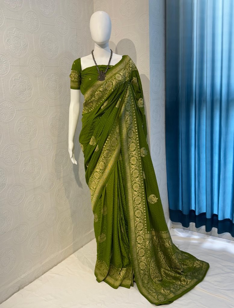 Step into elegance with our Parrot Green Pure Banarasi Chiffon Georgette Saree, crafted with timeless artistry and modern grace. This saree features a soft and pure chiffon georgette fabric with intricate self-weaving designs that exude sophistication. The highlight is its zari weaving rich pallu, adding a regal touch to your look.