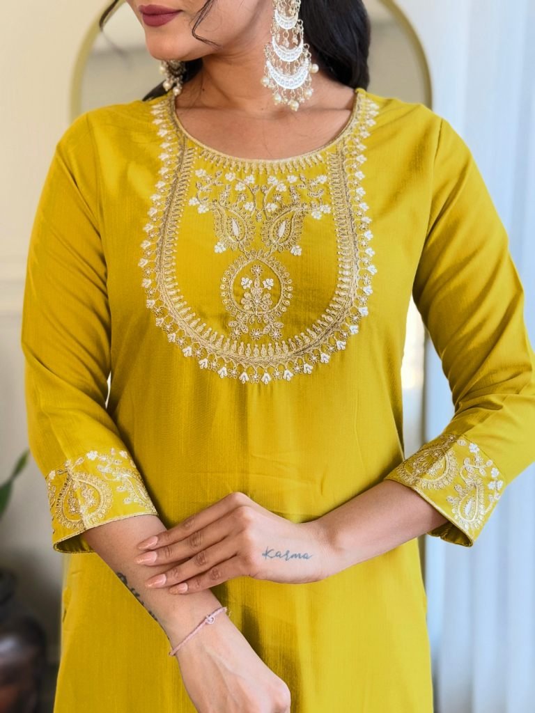Kurti: StitchedKurti Material: Rayon SlubWork: EmbroideredBottom: StitchedBottom Material: Rayon SlubDupatta: StitchedDupatta Material: OrganzaDupatta Length: 2.10 Meter