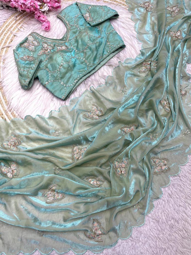 Product Details :-Fabric : Fandy Sattin Blouse : Fandy Sattin Fabric With Brits Work ( Sitch Blouse38+42)Work : Beautiful Khatli Brits Work Along With All Over Arco Bodar