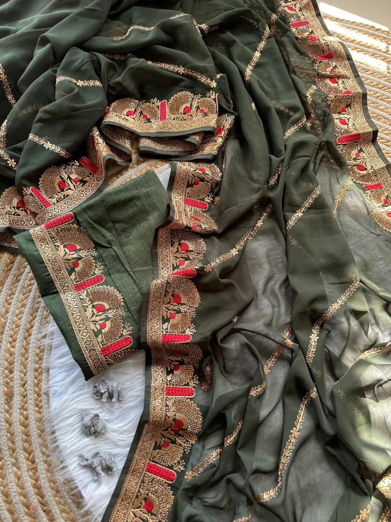 Work: Exquisite Zari Weaving And Intricate Embroidery Along The Border, Enhanced With Vibrant Meenakari Work. Traditional Motifs, Including The Elegant Peacock (Mayur), Add A Majestic Touch.
