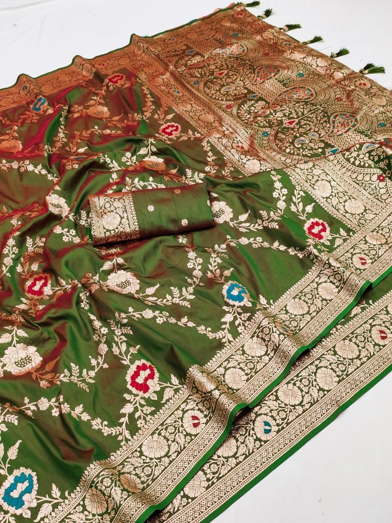 Saree :- Soft Banarasi Silk Saree With Zari Weaving Motifs Touchup Design All Over The Saree And Zari Weawing Swan Designer Pallu With Zari Weaving Swan Border And Tassels Attached At Pallu End