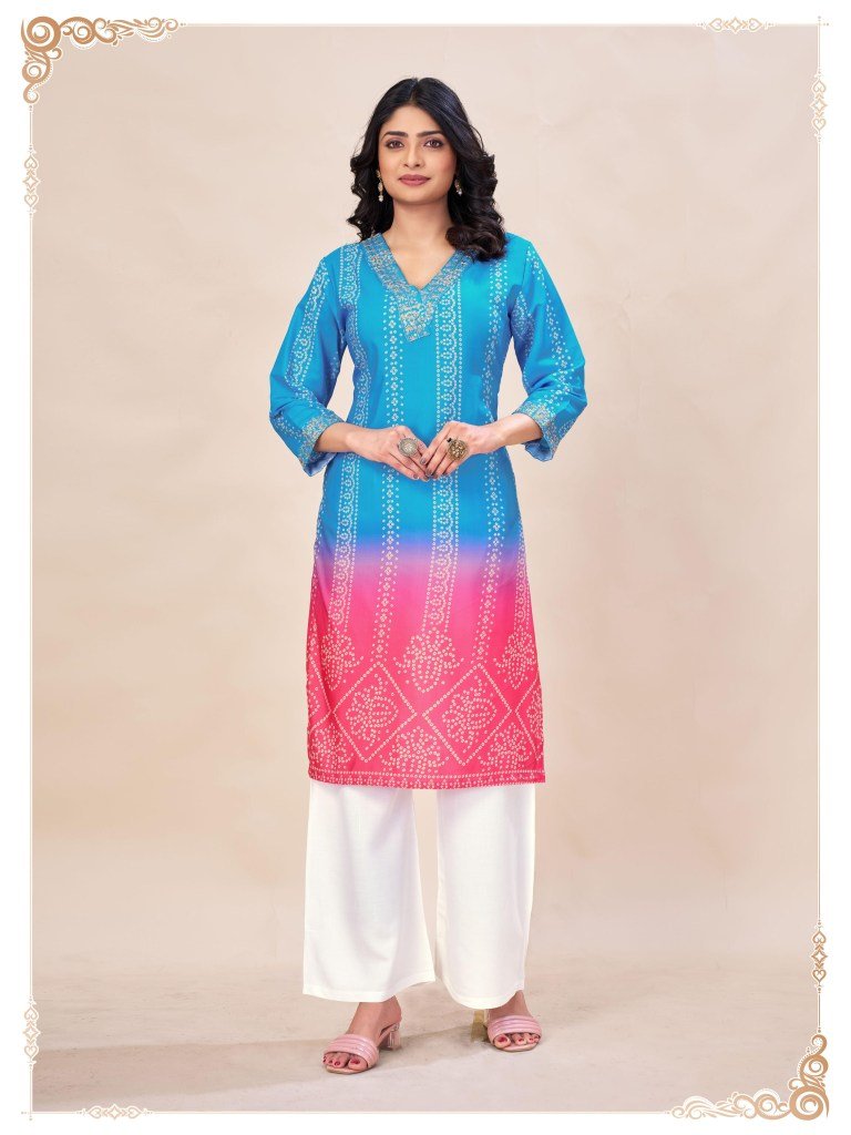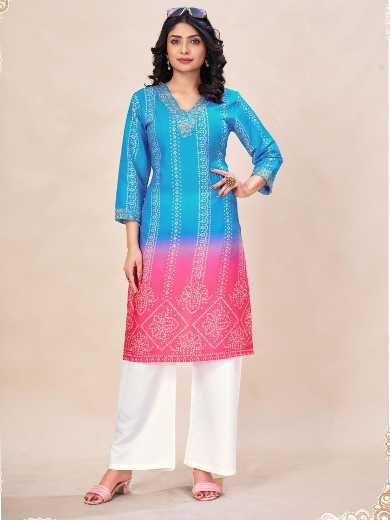 Kurti :Fabric : Rayon Colour : Pink And Purple Size : L,XL,XXLPant :Fabric : RayonColour : White Type : PlazzoDesign :Traditional Shaded Bandhani Print