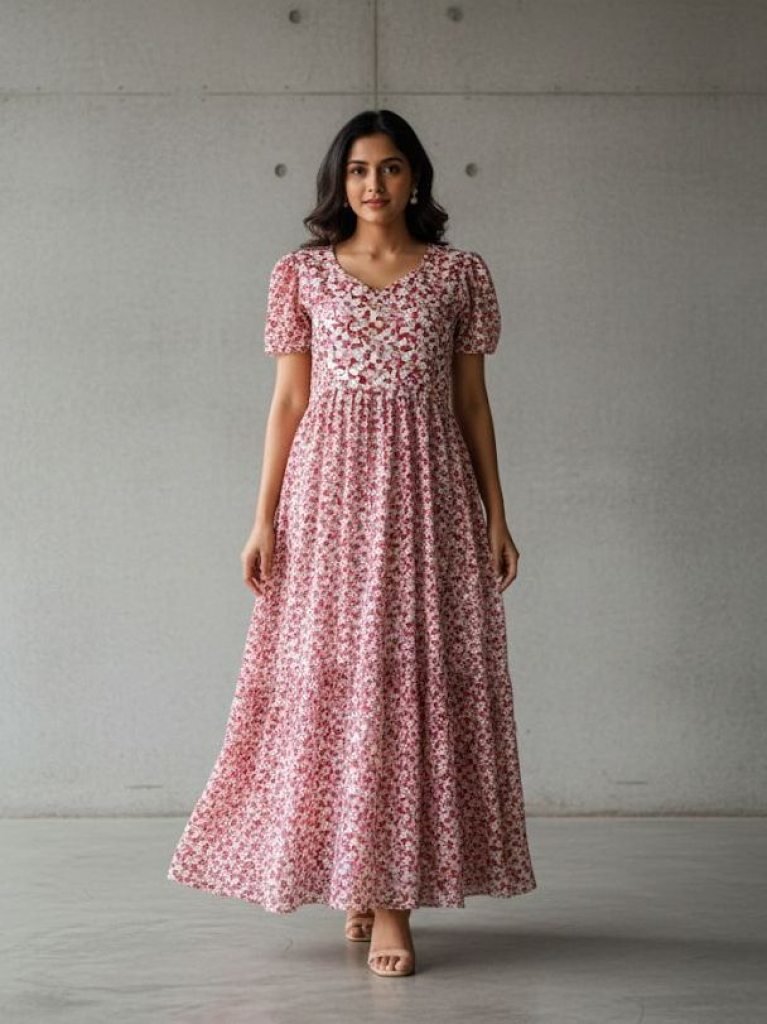 Material:- Fox GeorgetteComplete LinningLength:- 47Sleeves :- Short Sleeve Flare 3.5 MeterSize S-36 M-38 L-40 Xl-42 Xxl-44