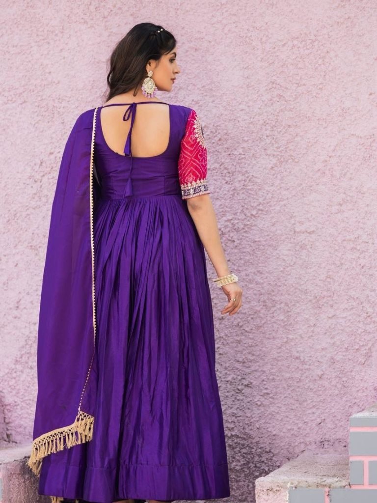 Gown: Pure Chinon With Bandhej, Heavy 3mm Sequence Embroidery, Micro Cotton Inner, 3.5m Flair, Fully Stitched.