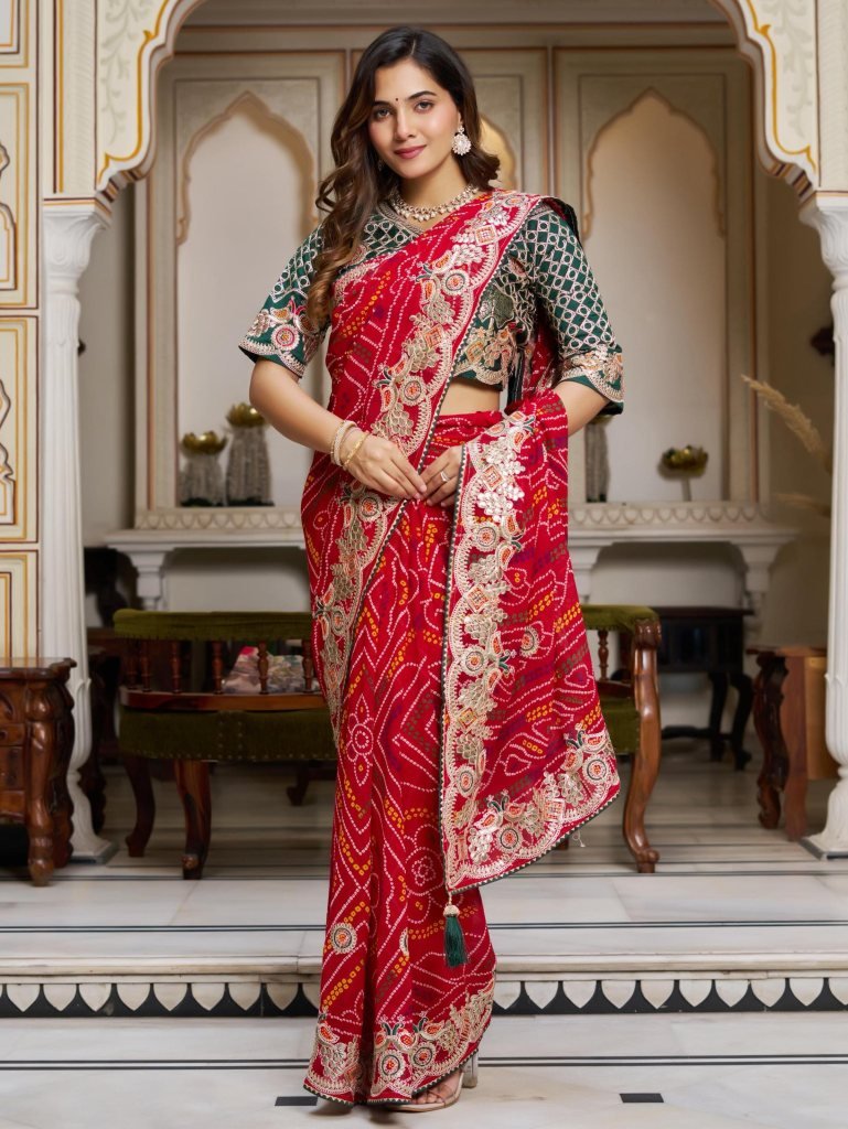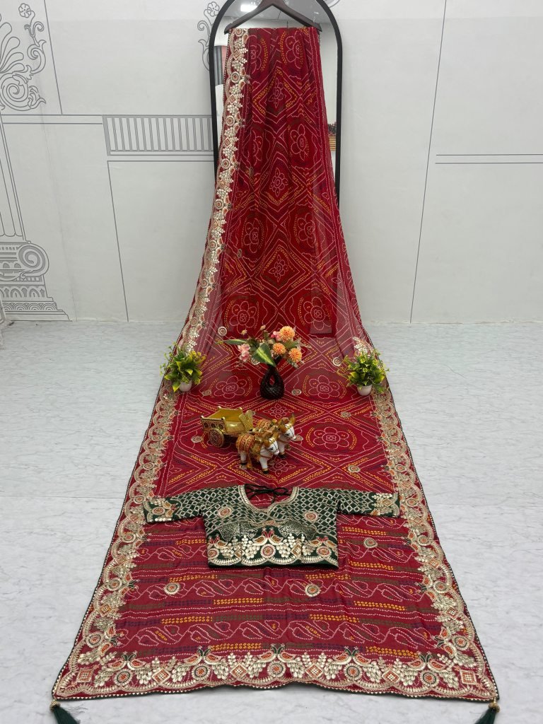 SareeFabric:- Pure Bandhrej Work:- Heavy Pitha & Gota Pati WorkCut:-5.50 MtrBlouse (Unstitched)Fabric:- Mono Silk Work:- Heavy Pitha & Gota Pati WorkCut:- 1.20mtr