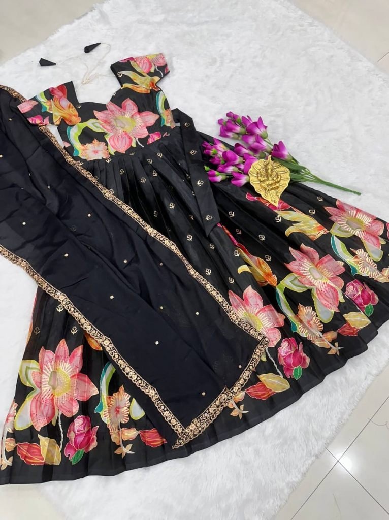 Full Stiched Pure Chinon Silk Fabric With Heavy Position Print Foil Work With Top Full Position Foil Printed With Heavy Quality And Inner Attached Canvas Finish And Full Flair Same As Pic Real Modeling