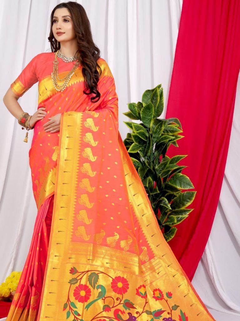 Fabric Details :-Paithani Pure Silk Handloom Saree With Pure Jari Pure Soft Silk With Gold JariSaree Cut 5.50 MeterBlouse 0.80 Meter
