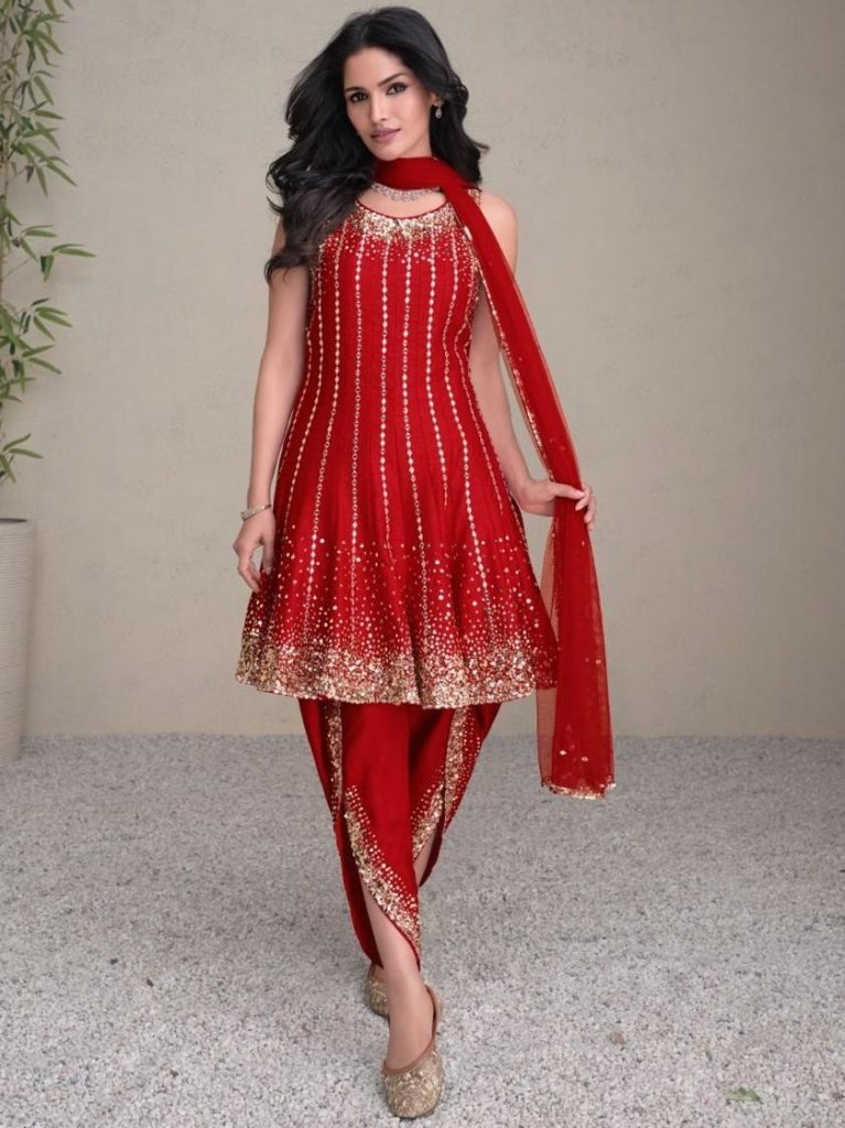 Fabric: Real Premium SilkWork: Elegant EmbroiderySleeves: Full SleevesBottom: Silk DhotiDupatta: Embroidered Net DupattaOccasion: Festive Wear, Wedding Functions, Party Wear