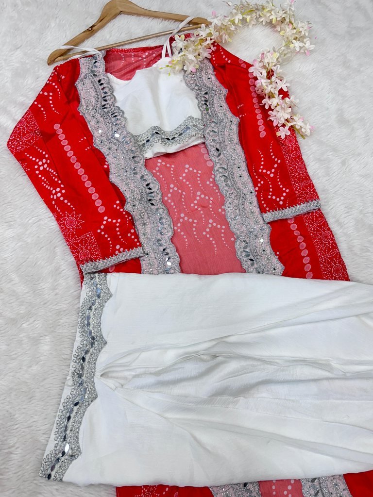 Beautiful Chinon Fabric Crop Top With Fusion Drape Skirt With Crape Lining & Long Jacket