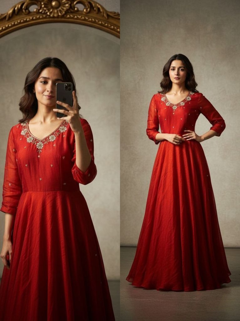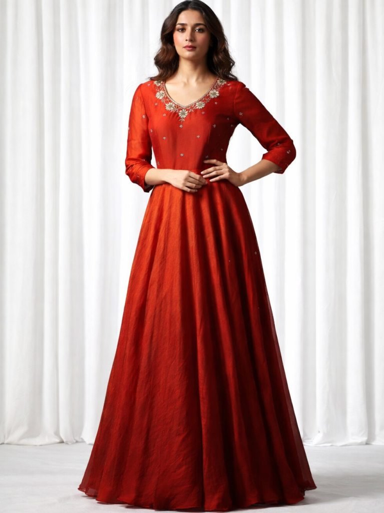 GownFabric :- Space Silk Work :- Moti Beads And Kardana Handwork Inner :- Micro CottonSize :- Xxs , Xs , S, M , L , Xl , Xxl , Xxxl Length :- 52 Inch