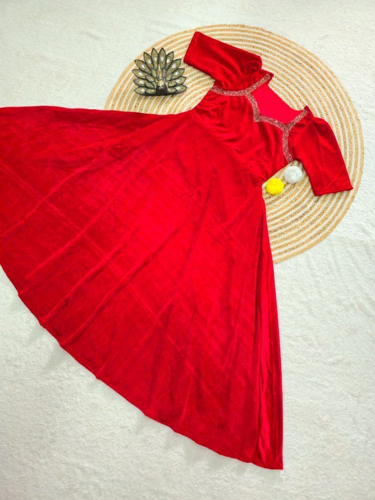 GownFabric :- Premium 9000 Velvet With Designer Hand WorkSize :- M L Xl XxlColour:- 4 Colour Length :- 44+Lining :- Micro Cotton