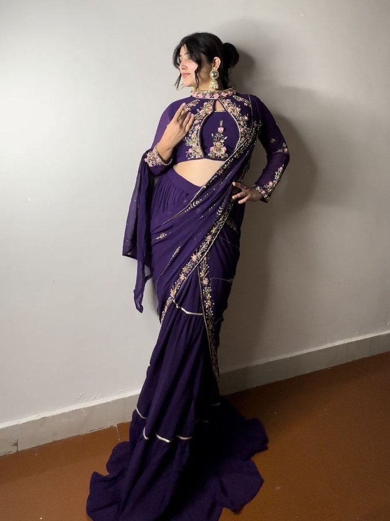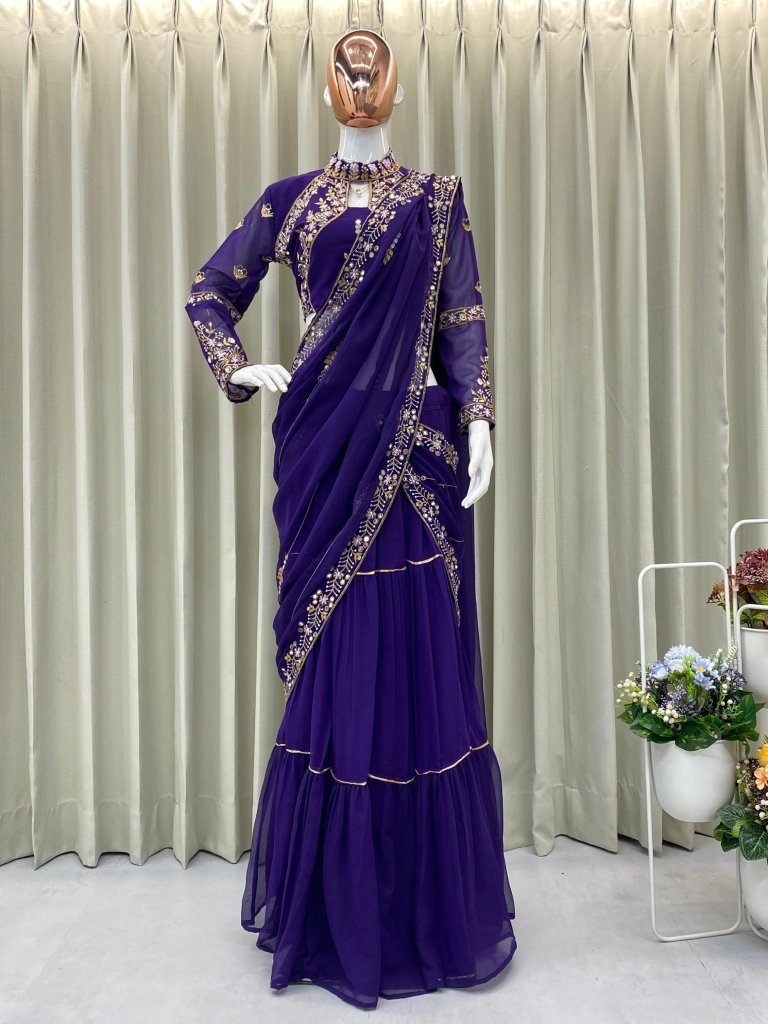 Saree : Faux Georgette With Ruffle And Embroidery Work With Mirror WorkFull Stitched Saree With Full Flair Blouse : Faux Georgette With Sequence Embroidery Work With Mirror WorkFull Stitched Fit Upto 44