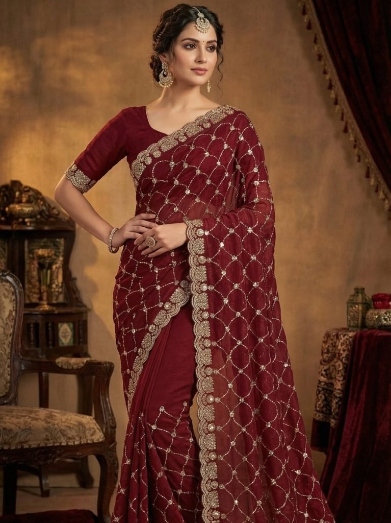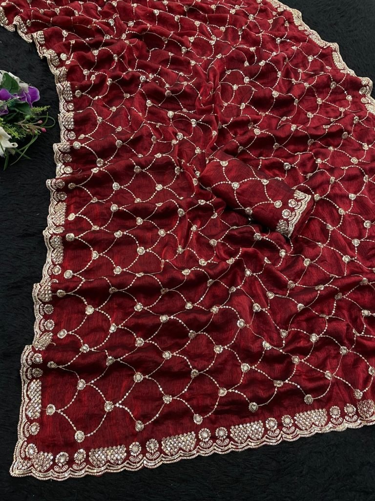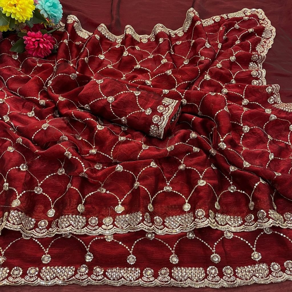 Saree:- Pure Fandy Chiffon Silk With Beautiful Sequence Embroidery Work With Cut Work BorderBlouse:- Paired With Fandy Sattin Heavily Worked Fancy Blouse