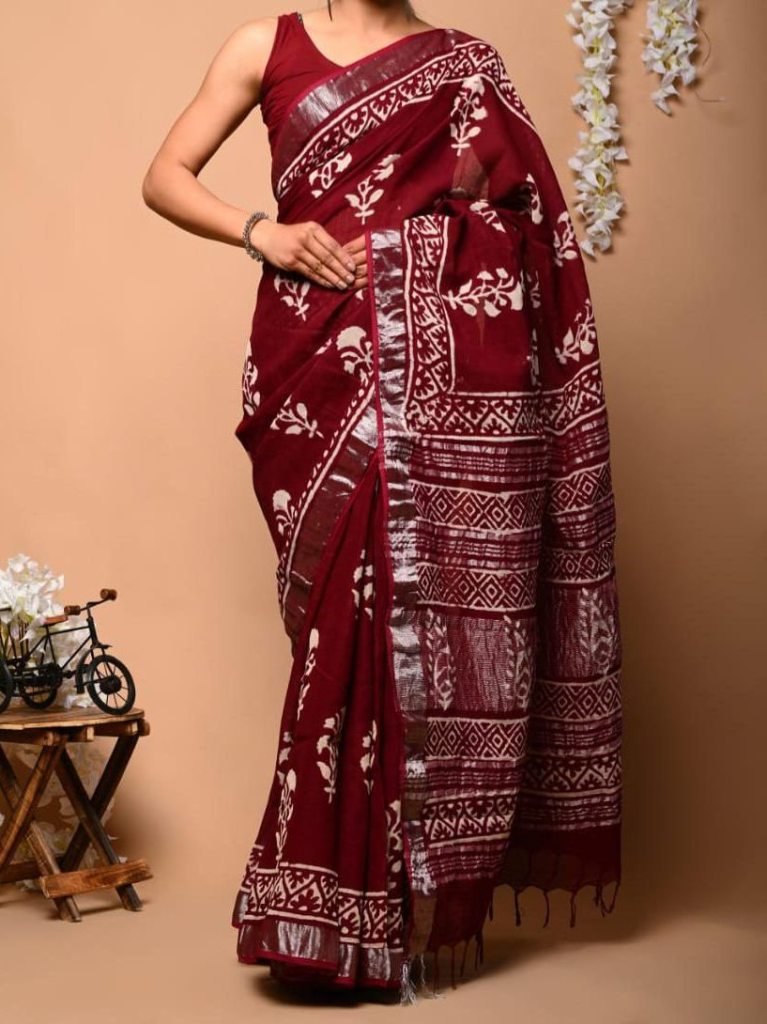 • Trendy Maroon Linen Digital Printed Saree Paired With Matching Blouse